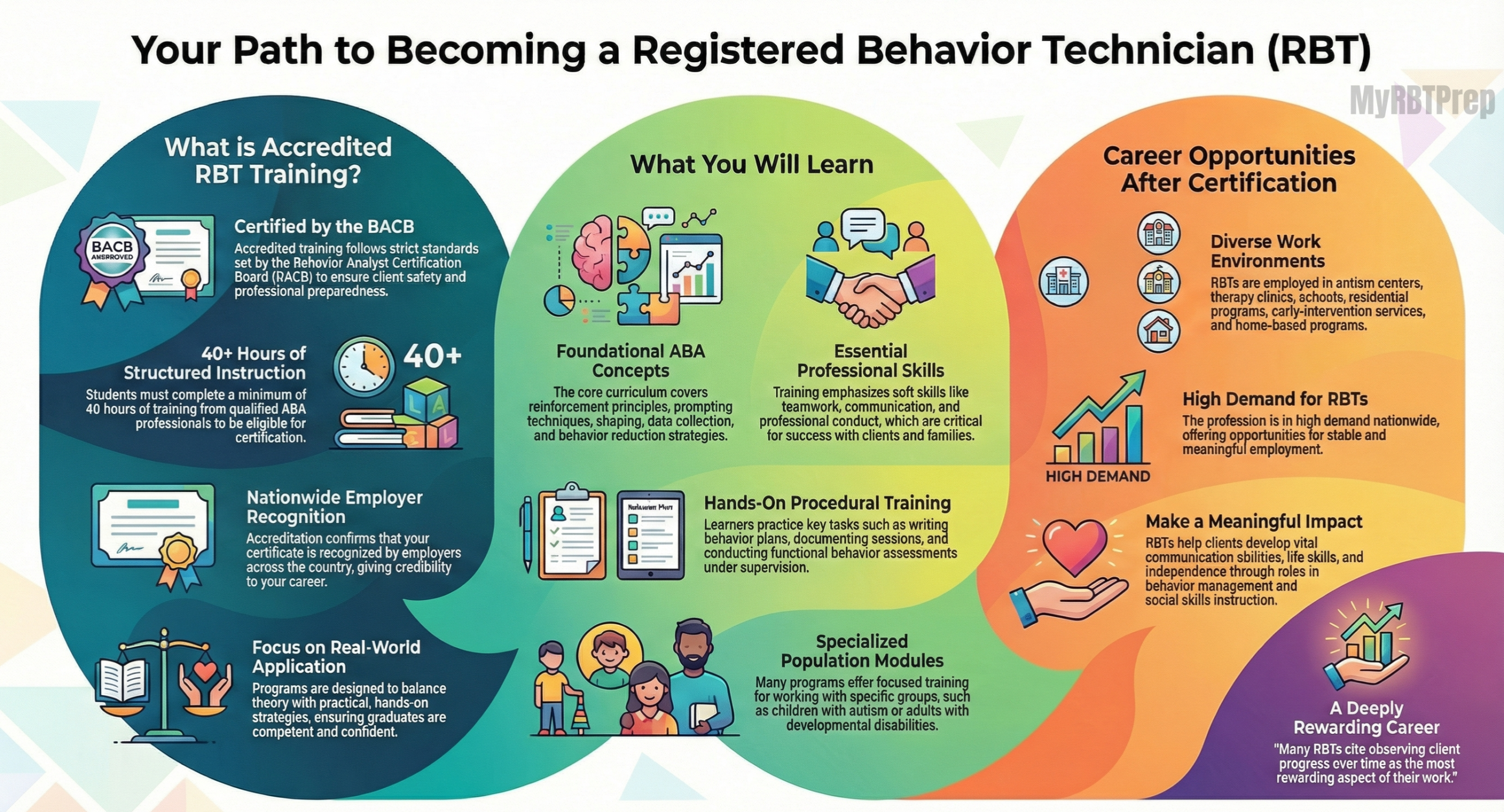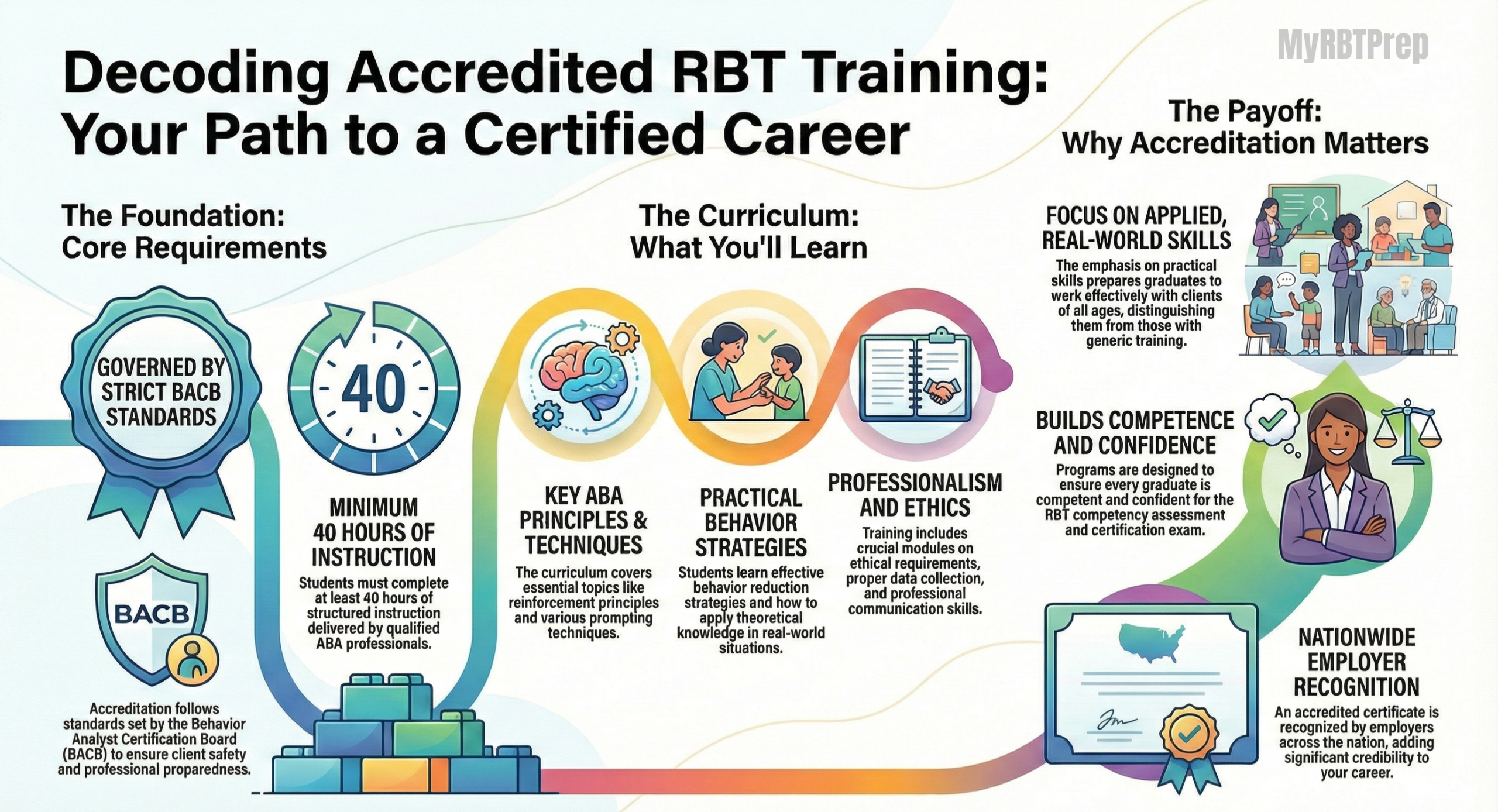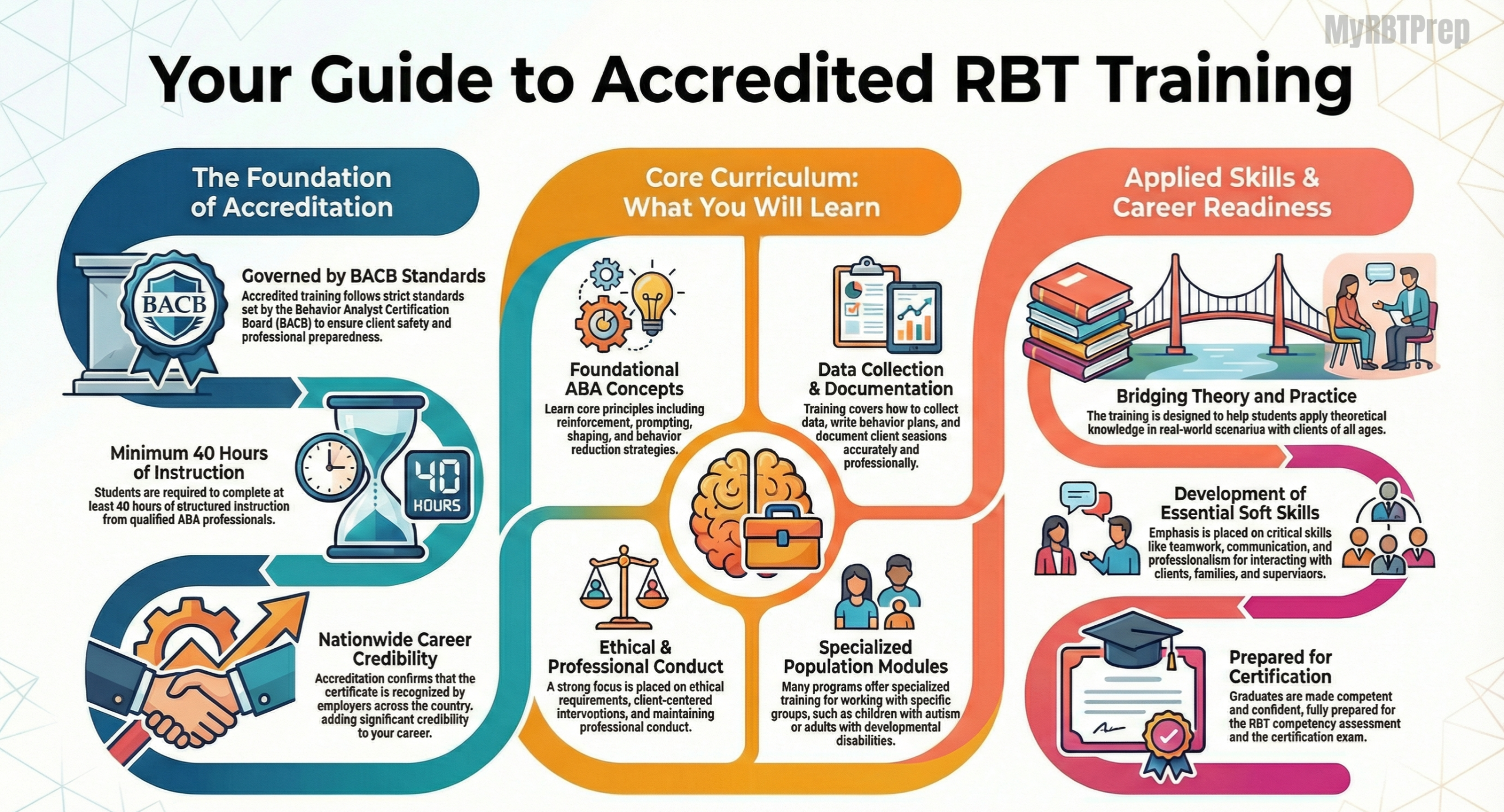Accredited RBT training follows strict standards set by the Behavior Analyst Certification Board (BACB) to ensure client safety and professional preparedness. Students must complete at least 40 hours of structured instruction from qualified ABA professionals.