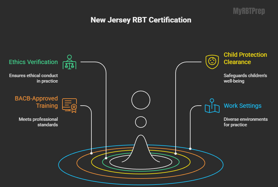 New Jersey requires a state ethics verification, child protection clearance, and BACB-approved training.