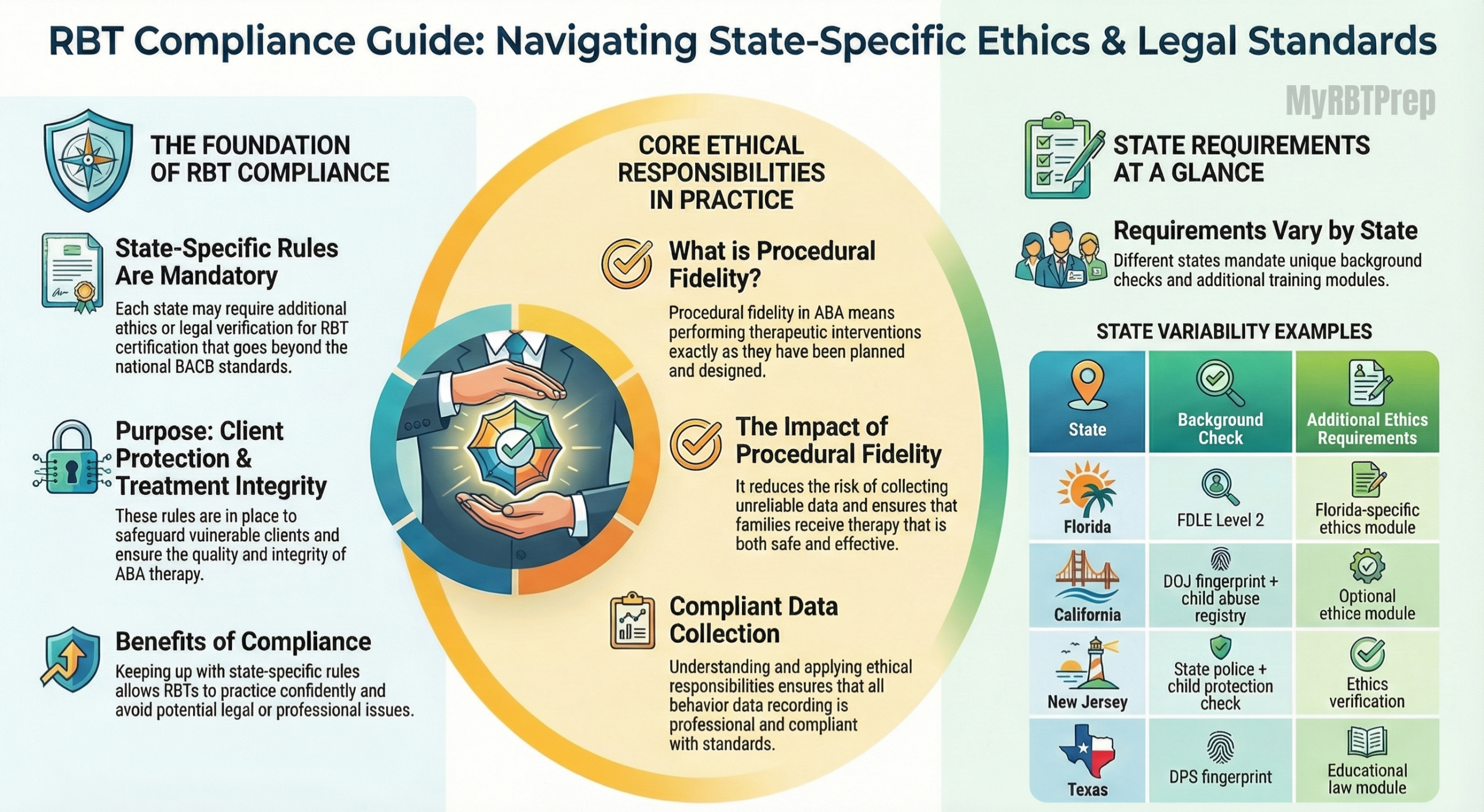 Each state may require additional ethics or legal verification for RBT certification beyond the BACB standards. These rules protect clients and ensure treatment integrity ABA. For example, Florida requires a Level 2 FDLE background check, while California mandates DOJ fingerprinting and child abuse registry clearance. Understanding ethical responsibilities of RBTs in data collection ensures that your behavior data recording is compliant and professional.