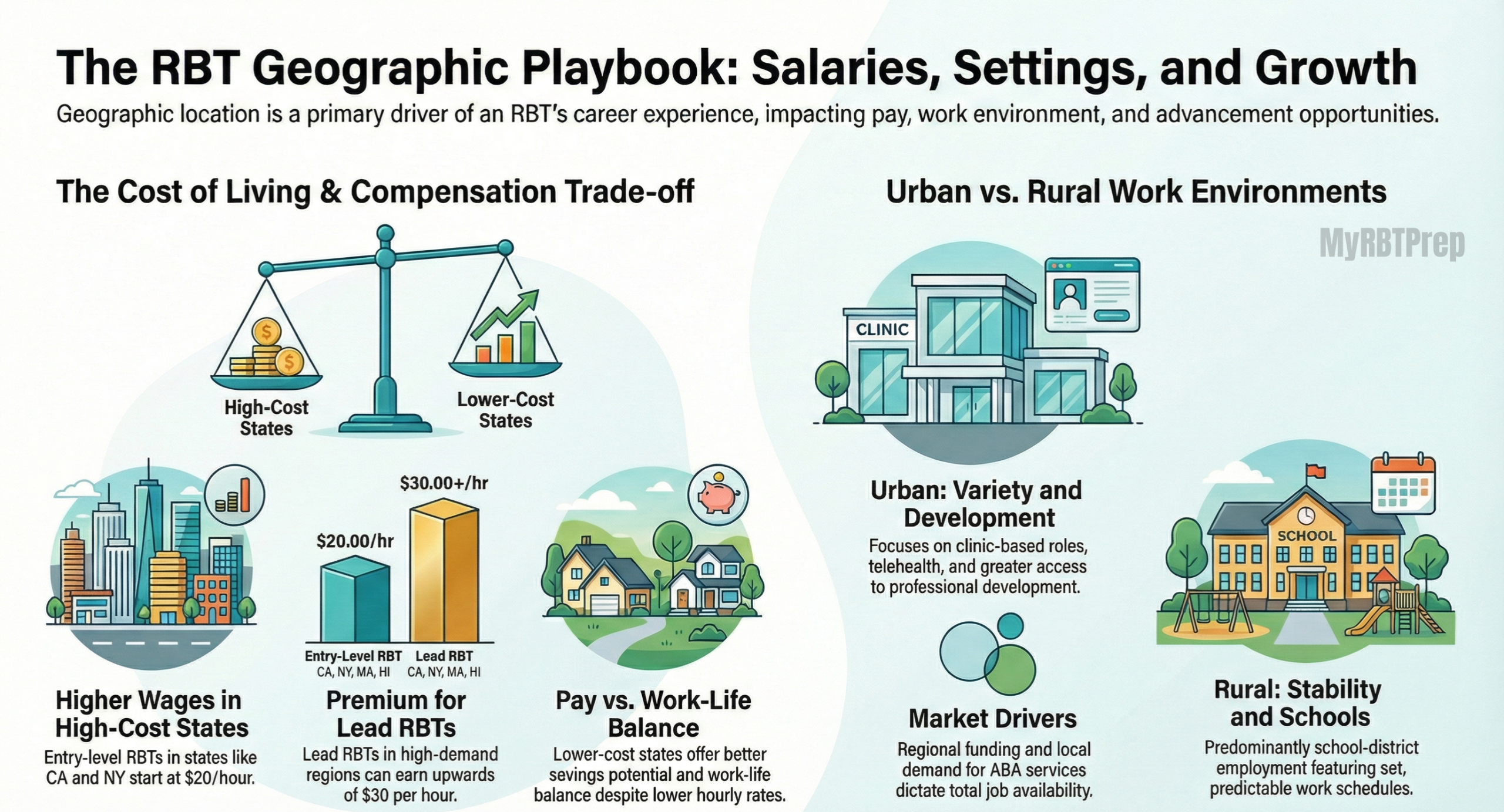 In addition, factors such as local demand for ABA services, travel time, and regional funding all impact the salaries paid and the number of job opportunities available to RBTs. Knowing these different geographic factors enables RBTs to select job locations that allow them to fulfil their career aspirations, earn the highest possible salaries and secure entry-level or senior RBT positions with continuing opportunities for advancement.