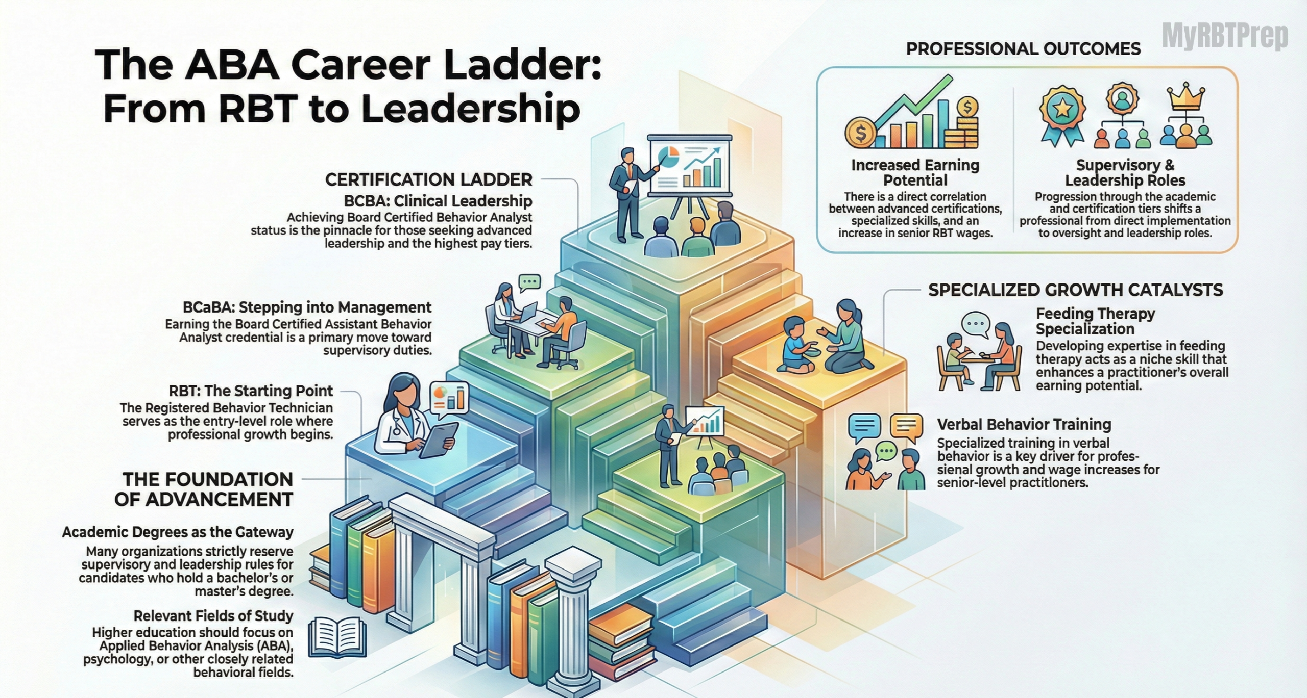 RBTs can advance by earning advanced certifications in ABA. The Board Certified Assistant Behavior Analyst (BCaBA) credential or Board Certified Behavior Analyst (BCBA) can lead to supervisory roles with higher pay. Specialized training like feeding therapy or verbal behavior also enhances earning potential.
