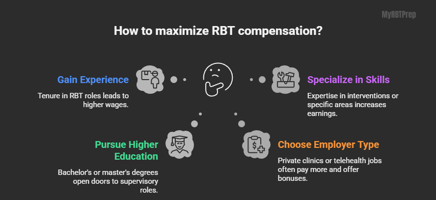 Employer type impacts RBT salary significantly. School district RBT roles provide structured pay and benefits, whereas private clinics or telehealth RBT jobs often pay more and offer bonuses and incentives for RBTs. Skills in evidence-based behavior interventions and specialization in areas like feeding therapy or verbal behavior can further increase earnings.