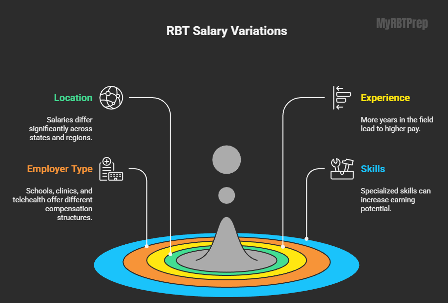 Cost of living strongly affects pay. For example, RBTs in Hawaii earn more per hour, but living expenses are higher. Conversely, midwestern states may pay less, but affordable housing and lower expenses can balance overall quality of life.