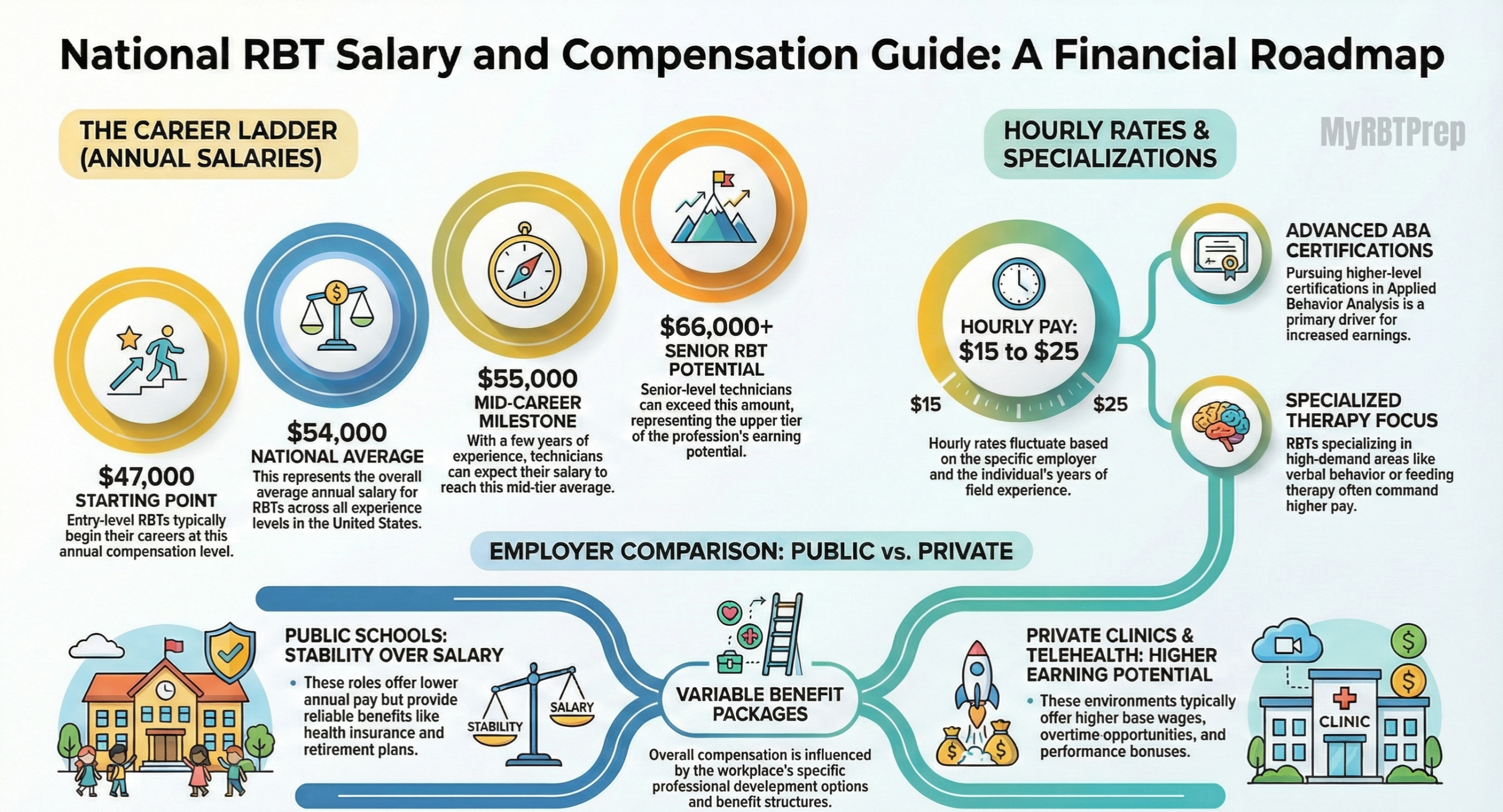 | Market Comparison | Compare school district RBT roles, clinic-based RBT positions, and telehealth RBT jobs to understand market rates. |