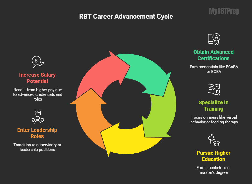 Career progression for RBTs is often tied to advanced certifications in ABA. Pursuing credentials like Board Certified Assistant Behavior Analyst (BCaBA) or eventually Board Certified Behavior Analyst (BCBA) can lead to supervisory roles and significant salary increases. Specialized training (verbal behavior, feeding therapy) also boosts opportunities for high-paying positions.