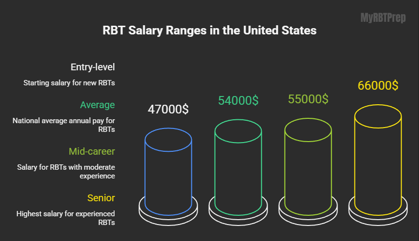 The national salary data for RBTs shows that the average annual pay in the United States is around $54,000. Entry-level RBT pay typically starts near $47,000, while mid-career RBT salary reaches about $55,000, and senior RBT wage can exceed $66,000. RBT hourly wage ranges from $15 to $25 depending on experience and location.