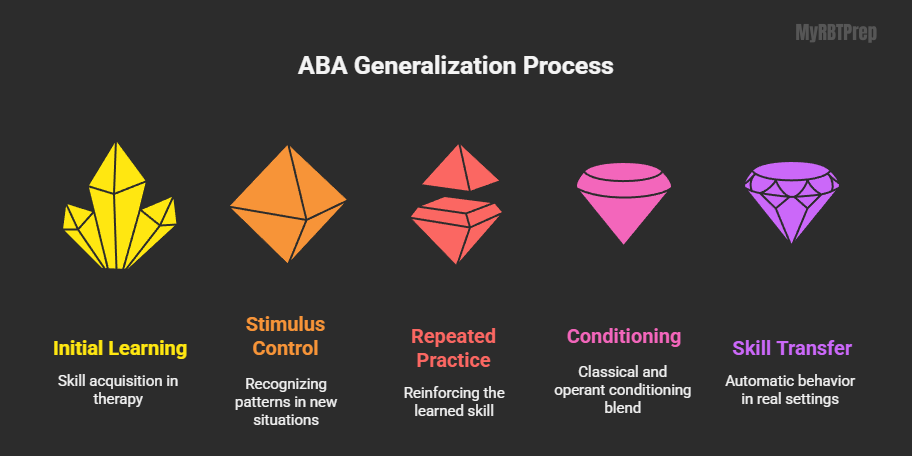 | Stimulus Generalization | Learned behavior transfers to new, similar situations | Teach a skill in one setting (e.g., therapy room) and practice across others (home, school) | Ensures functional skills are used in daily life |